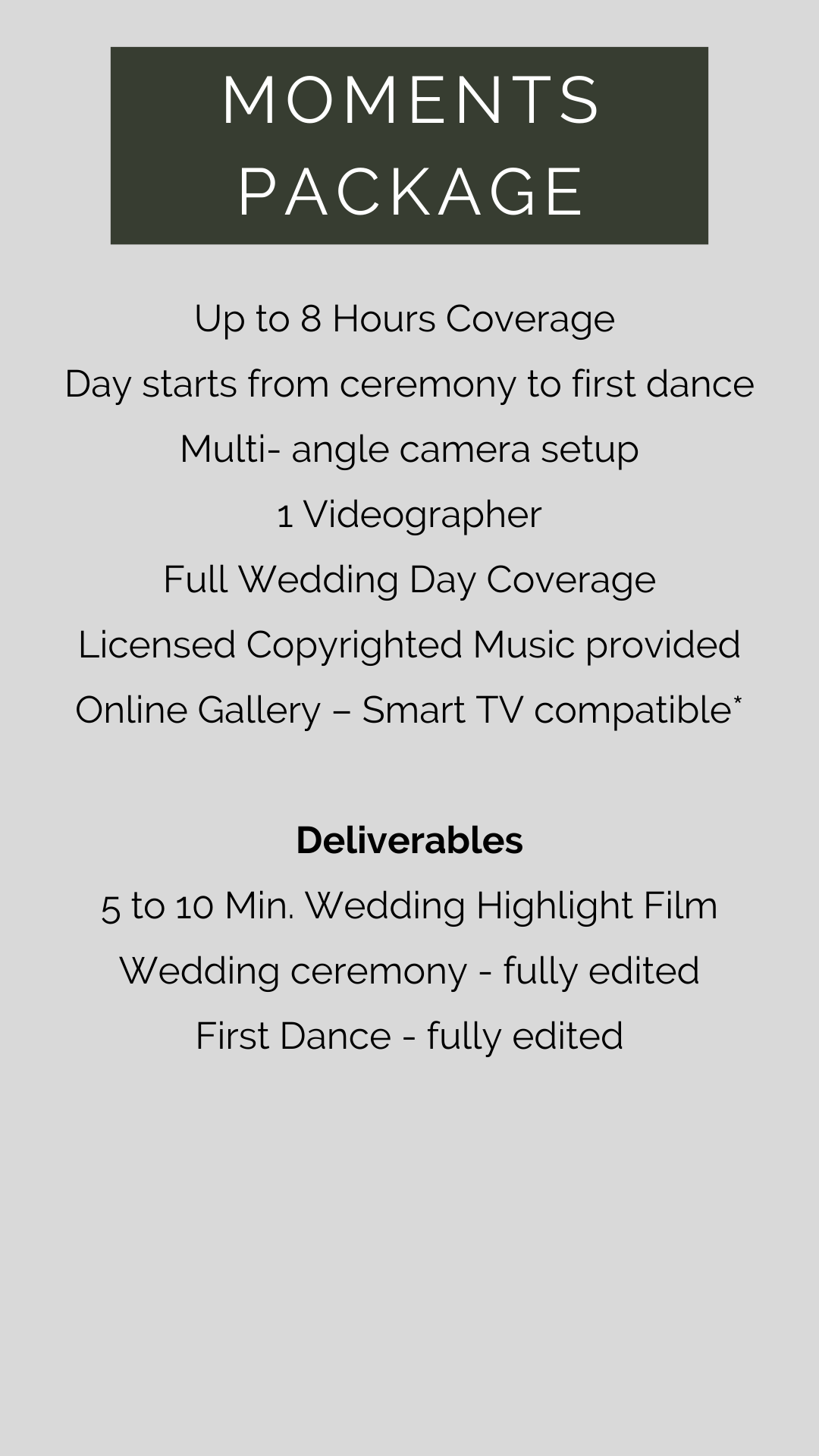 We have just two packages to simplify the whole process of choosing your ideal wedding package. If you'd like to have a package that is specicfic to your budget, we can help with that.